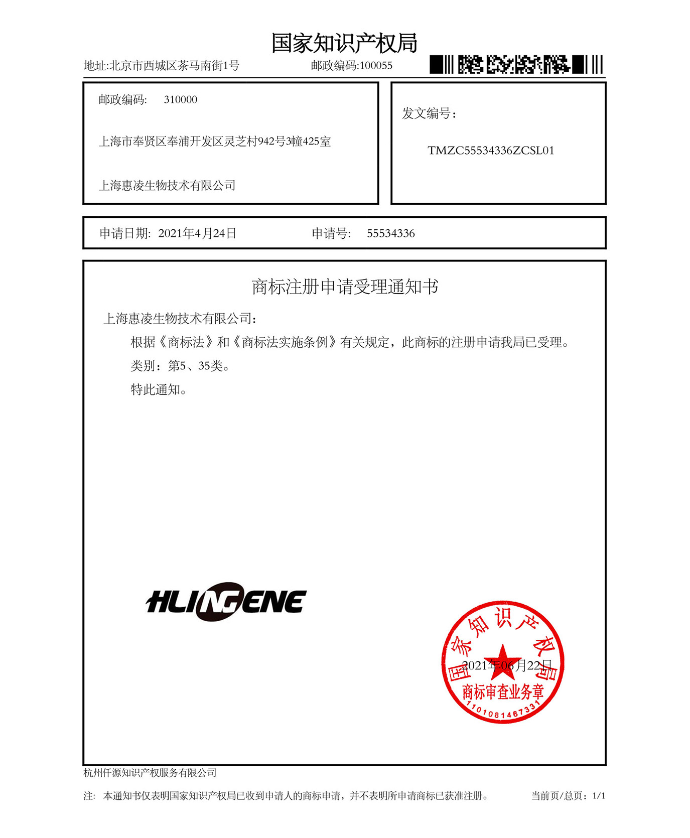 上海惠凌(HLingene)生物技术有限公司商标申请号:55534336。