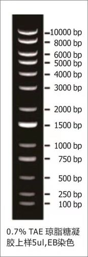 DNA条带组成,适用于对 100 bp至 10 kb的双链DNA分子大小的估算和粗略定量。